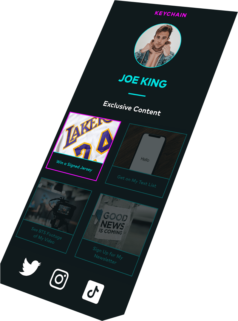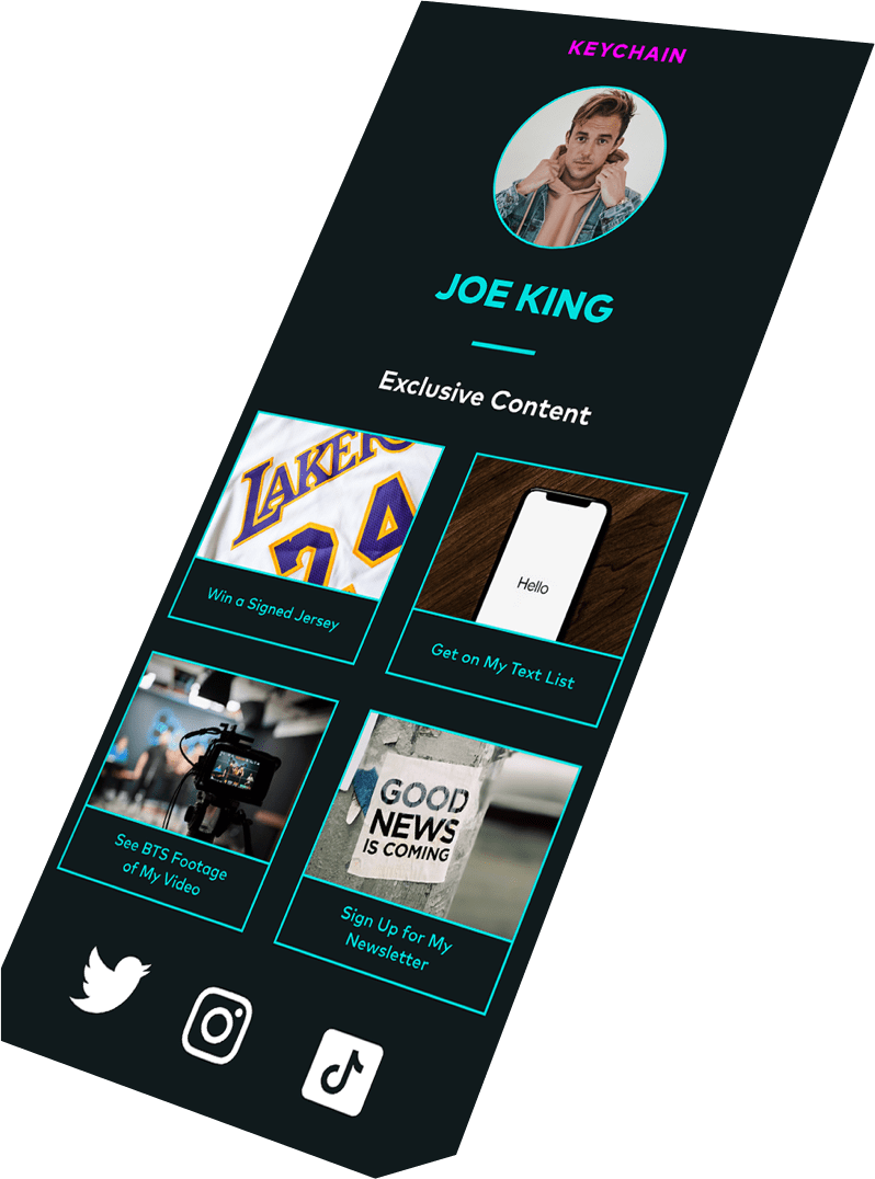 Populate your Keychain page with custom links to your content, I.E. newsletters, exclusive photos + videos, merch, contests, and SMS contact lists.